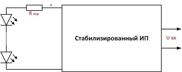 В случае использования токограничивающих резисторов, напряжение желательно стабилизировать. КПД при таком включении складывается из КПД стабилизатора напряжения и потерь на резисторе и не превышает 80%, в то время как КПД современных драйверов-стабилизаторов тока не ниже 95%.