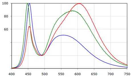 Спектры светодиодов с разными цветовыми температурами: 5000K (синий), 3700K (зеленый), 2600K (красный). Подробнее тут.
