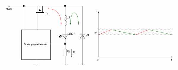 Здесь светодиод включается последовательно с катушкой. Схема управления отслеживает ток с помошью измерительного резистора R1 и управляет ключом T1. Если ток через светодиод падает ниже заданного минимума, транзистор открывается, и катушка с включенным последовательно с ней светодиодом оказывается подключенной к источнику питания. Ток в катушке начинает линейно нарастать (красный участок на графике), диод D1 в это время заперт. Как только схема управления регистрирует достижение током заданного максимума, ключ закрывается. В соответствии с первым законом коммутации катушка стремится поддержать ток в цепи за счет энергии, накопленной в магнитном поле. В этот момент ток протекает через диод D1. Энергия поля катушки расходуется, сила тока линейно убывает (зеленый участок на графике). Когда ток падает ниже заданного минимума, схема управления регистрирует это и снова открывает транзистор, подкачивая энергию в систему – процесс повторяется. Таким образом, ток поддерживается в заданных пределах.