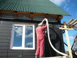 При помощи этого способа на поверхности наружных стен напыляется слой защитного материала. Для получения раствора с помощью оборудования происходит перемешивание полиола и полиозициона. Одновременно с этим происходит вспенивание средства с помощью углекислого газа. Готовая смесь, поступает в монтажный пистолет.