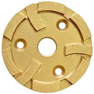 Одновременно с чашкой для проведения работ может использоваться диск для шлифовки бетона. Этот инструмент предназначен для насаживания на болгарку и имеет такое же напыление, как и чашка. Алмазные резцы прикрепляются к поверхности диска из металла путем проведения лазерной сварки. Эти диски делятся на круги для сухой и мокрой резки, отличаются наличием прорезей (на втором диске их нет). Сухая шлифовка применяется, когда мастер имеет дело с чистым материалом, а мокрая – если имеются дополнительные декоративные включения вроде гранитных или мраморных мелких элементов.