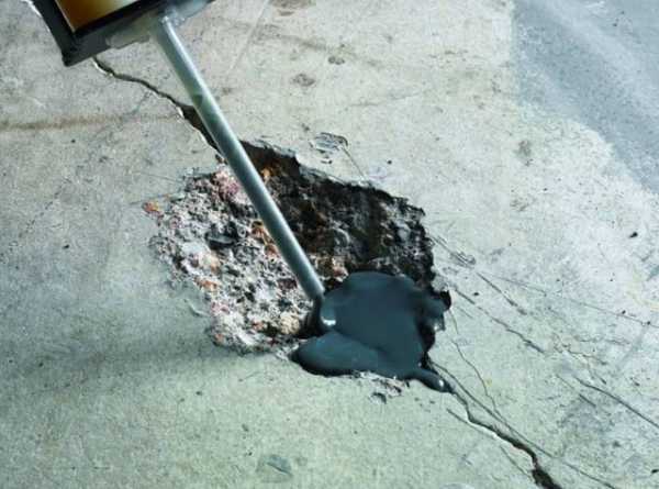Теперь удалим иные дефекты бетонного покрытия, такие как трещины и выбоины. Для этого нам потребуется эпоксидная мастика. Данные неровности вначале тщательно очищаем от грязи, обрабатываем грунтовкой и затем заполняем мастикой.