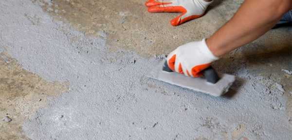 - выбоины. Срезать алмазным диском глубиной до 2 см. Убрать поврежденный срезанный участок, вычистить полость от пыли и обработать грунтующим составом. В полость заливается раствор (лучше безусадочный) и выравнивается правилом. Застывший участок отремонтированного пола шлифуется.