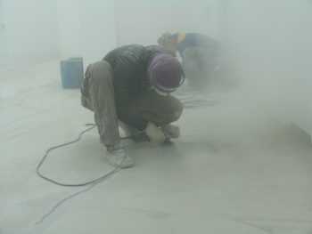 К тому же, если сухой метод затрагивает только 2 мм верхнего слоя, то мокрый снимает до 5 мм. Из-за этого при первичной обработке спустя 3-5 дней после заливки стяжки, в воздух поднимается огромное количество мокрой пыли, иначе говоря шлама.