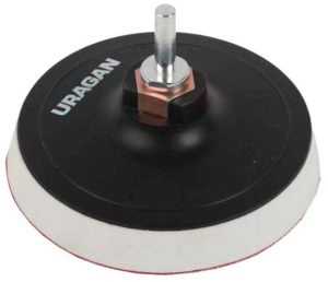 Тарелочные изделия имеют стандартное устройство. Они работают, как шлифовальные изделия. Однако в месте резьбы они оснащаются стержнем. Наждачная бумага прикрепляется к таким насадкам за счет липучки.