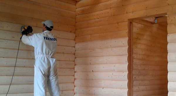Обработка сруба внутри домаВсе действия идентичны. При шлифовке сруба из строганного бревна, если стена внутри ничем не будет обшиваться, добавится еще один проход для чистовой отделки: эксцентриковой шлифовальной машинкой с абразивным диском на 120. Это позволит добиться идеально ровной поверхности.