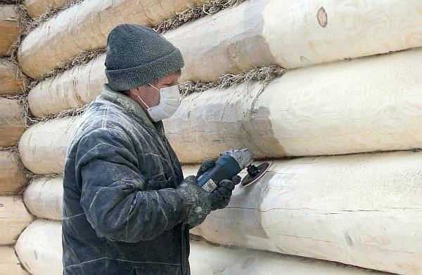 Большинство при шлифовке сруба работают болгарками с разными насадками