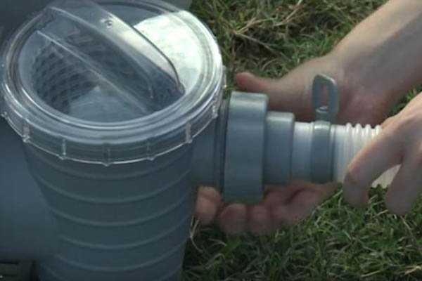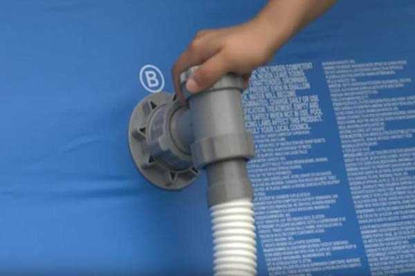 Присоединить шланг к бассейну легко: нужно вставить конец шланга в выпуск бассейна и затянуть накидную гайку. Внутри бассейна есть пробка, предохраняющая от преждевременного слива