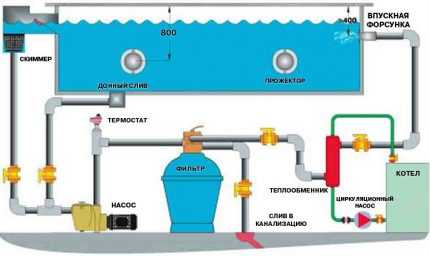 Отобранная через скиммеры и донные отверстия вода подается на фильтр грубой очистки, после этого под действием циркуляционного насоса перемещается для более тонкой очистки на фильтрующую станцию.