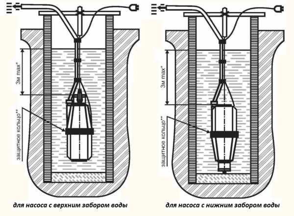 Варианты крепления погружных вибрационных насосов с верхним и нижним забором воды