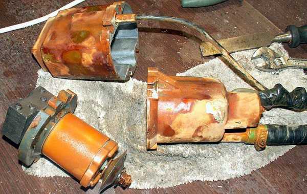 В электрической половине смотрим на компаунд. Если он отслоился, то аккуратным постукиванием молотка по корпусу определяем участок. Если он небольшой, то можно попробовать вылечить неисправность заливкой эпоксидной смолы.