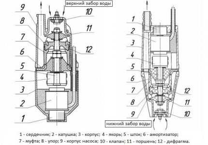 В другой половине корпуса находится гидравлическая камера. В ней располагается сердечник на резиновом амортизаторе. Движение сердечника корректирует резиновая мембрана. На сердечнике стоит поршень. А для направления потока откачиваемой жидкости на заборном патрубке ставится обратный клапан.