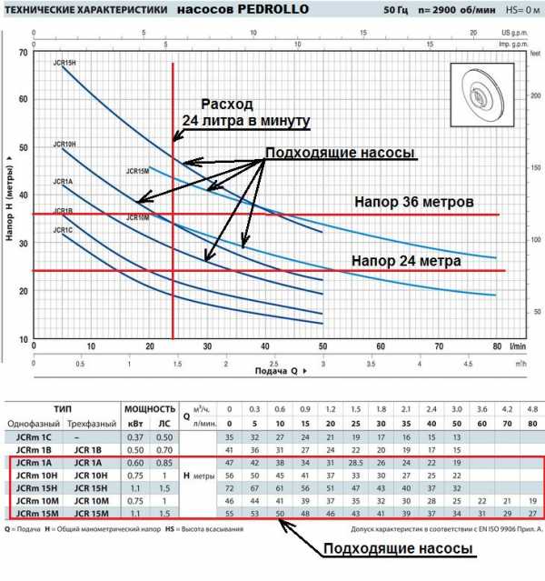 Например, Q/H- графики насосов Pedrollo серии JCR. Между минимальным и максимальным необходимыми нам напорами расположены графики трех насосов: 1А, 10М, 10Н. Если брать с запасом, то подойдут еще 15М и 15Н. С их помощью можно обеспечить водой и третью точку водоразбора. А вот насосы 1С и 1В нам не подходят, хотя 1В, казалось бы, проходит по заявленным производителем характеристикам.