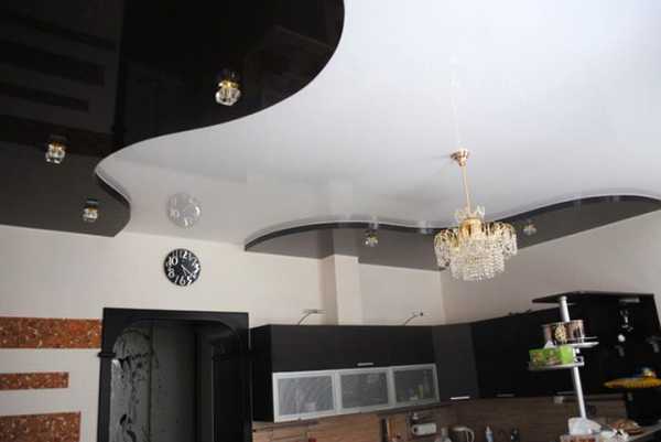 Уникальным покрытием является натяжной двухуровневый потолок бело-чёрного цвета. Смотрится он гармонично и контрастно. Помещение с таким потолком выглядит стильно, аристократично.