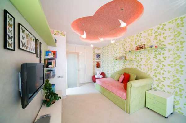 Одним из оригинальных решений оформления потолка является двухуровневый потолок белого цвета по периметру и фотопечатью в центре. Белое обрамление рисунка выгодно подчёркивает картину, нанесённую при помощи фотопечати.