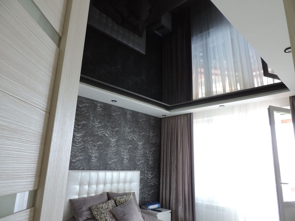 Натяжной черный потолок в спальне фото: Черный глянцевый натяжной потолок в интерьере спальни, гостиной
