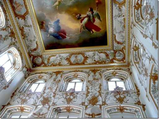 Двухуровневый потолок в обеденной зале Петергофа поражает роскошью и красотой