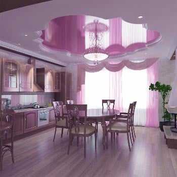 Даже самые простые конструкции с минимальным зазором между основанием и пленкой смогут стать настоящим украшением кухни, например, если скомбинировать несколько цветов, нанести цветное фото по центру в трехмерном изображении, сочетать глянцевое и матовое покрытие. По желанию натяжные потолки формируют на базе ПВХ пленки в сочетании с цветными гипсокартонными листами.