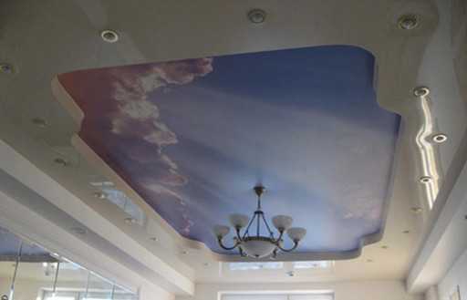 Потолок с рисунком фотоОбычно натяжные потолки делают из полотен двух контрастных оттенков. Однако сегодня распространены идеи потолочного дизайна, когда конструкции оформляют пленкой ПВХ с тематическими рисунками. В тандеме с другим уровнем такой шедевр напоминает художественную картину в раме. Если нужно внести в интерьер нотки природы, выберите полотно с изображением лазурного неба или лесного пейзажа.