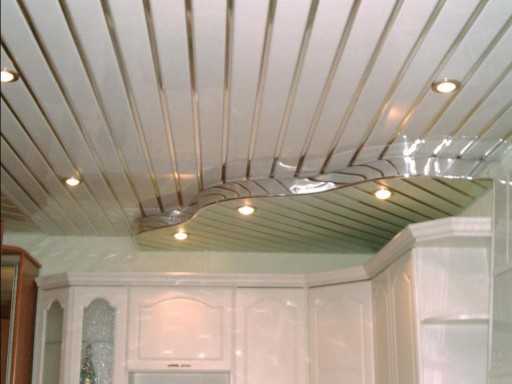 Отделка кухонного потолка штукатуркой, лепниной, стеклом и плиткой ↑