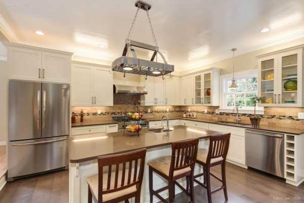 Иногда уровни выделяют цветом, иногда оставляют в одной гамме, добавляя подсветку, по преимуществу, состоящую из вмонтированных в один из уровней светильников. Когда точечное освещение расположено на верхнем слое, эффект один, а когда на нижнем – совершенно другой. Атмосфера в кухне во втором случае будет более комфортной и интимной, а в первом – несколько более торжественной.