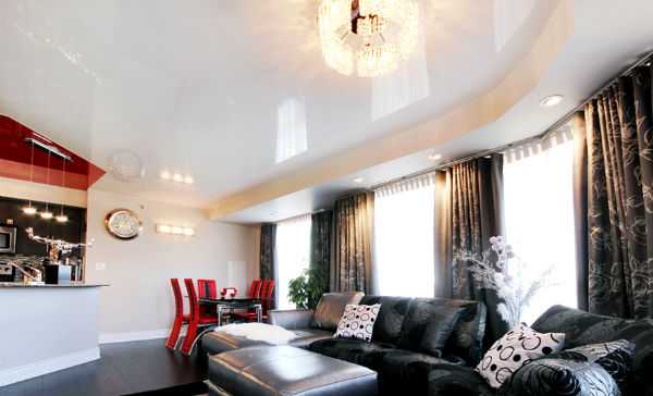 Достоинства и недостатки натяжных потолков при использовании в залах и гостиных