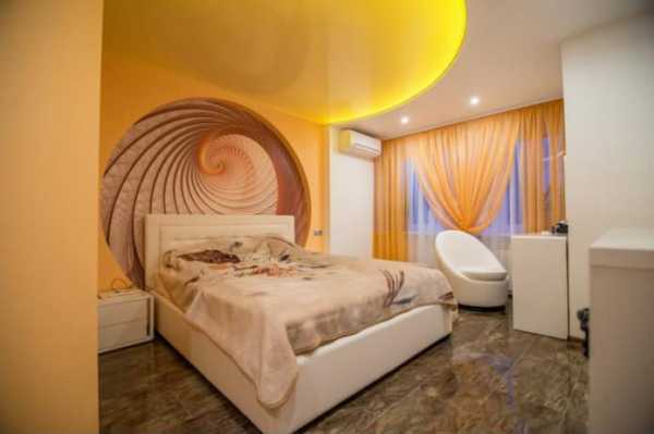 Разобравшись с техническими моментами, можно перейти к внешнему разнообразию натяжных потолков для спальни и их дизайнерских возможностях.