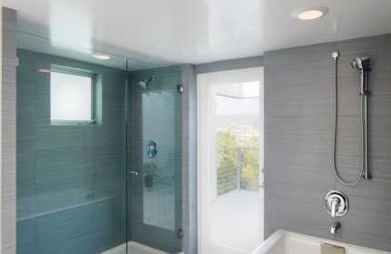 Существует несколько не самых явных нюансов, на которые следует обратить внимание обязательно. Например, выбирая, какой сделать потолок в санузел – матовый или глянец, далеко не все задумываются об отражениях. А сделать это нужно обязательно – размещенный над душевой кабиной, глянцевый потолок будет отражать все, что происходит внизу и если стенки таких кабин обычно делают непрозрачными для сохранения приватности, то отражение в глянцевой поверхности над душем сведет все усилия на нет.
