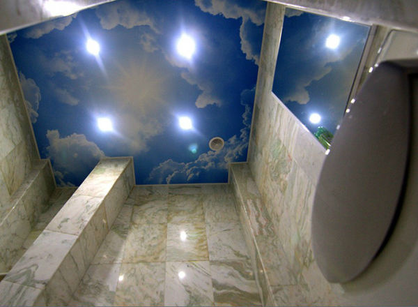 Глянцевый потолок визуально расширяет пространство помещенияБольшой плюс натяжных потолков – это широкий диапазон расцветок, позволяющий выбрать оттенок, который будет гармонировать с отделкой ванной, а то и станет изюминкой интерьера. Впечатление нарядности усилят встроенные светильники или скрытая светодиодная подсветка. Очень красив однотонный потолок или же гармонично скомбинированный из нескольких цветов. Эффектно выглядит нанесенная на пленку фотопечать, например, картина ясного голубого неба с легкими облачками. Если ванная довольно просторная, то можно заказать многоуровневый натяжной потолок.