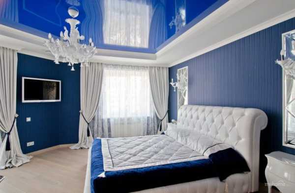 Если во время оформления комнаты вы отдали предпочтение светлому оттенку обоев, то идеальным вариантом будет использование в дизайне натяжных потолков для спальни синего глянца. Максимальная гармония при этом будет достигнута, если интерьер будет дополнен аналогичными по цвету деталями – подушками, светильниками и т.п.
