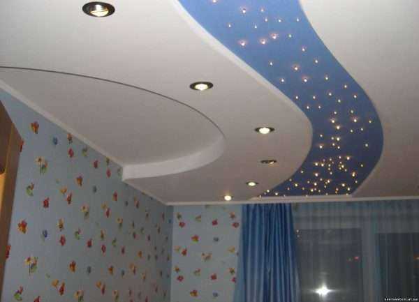 - Можно, конечно, натянуть плёнку и в двух уровнях, и даже в разных плоскостях. Но некоторые варианты потолочного дизайна предполагают сооружение различных выступов, открытых и закрытых ниш, которые используются для монтажа точечного освещения и внутренней подсветки. А с этой задачей гипсокартон справляется лучше.