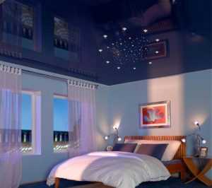 Любители интимной романтической обстановки могут использовать систему «звездное небо» в дизайне натяжных потолков для спальни.
