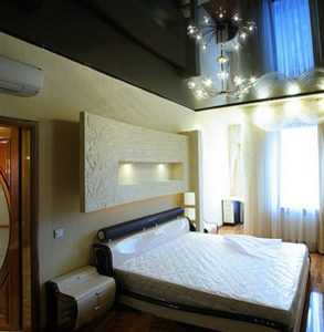 - Иначе, получится полная безвкусица. На нашем следующем примере, прекрасный вариант дизайнерского оформления спальни, где использована чёрная глянцевая плёнка. Она натянута не по всей площади потолка, а только в углублении, создавая тем самым эффект «бездонного неба». Это хороший вариант для комнаты с недостаточной высотой, хотя, для спальной комнаты, это не так уж плохо.