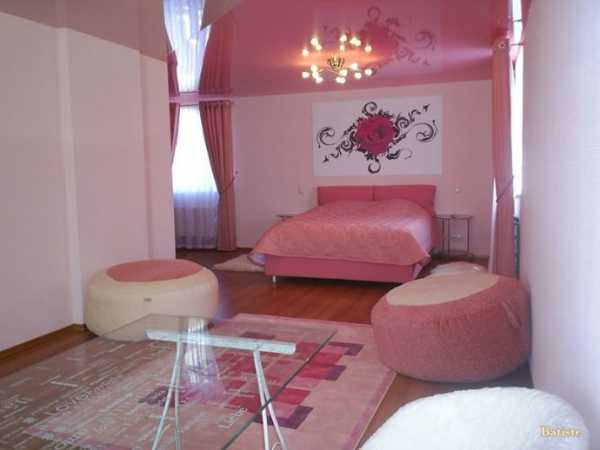 - Белый натяжной потолок с розовыми узорами очень лирично гармонирует с розовыми стенами