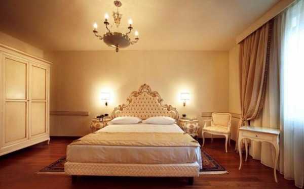 Отделка комнаты может быт выполнена в разных стилях и очень важно, чтобы натяжные потолки, выбранные для отделки спальни, подходили к нему, как на представленном далее фото.