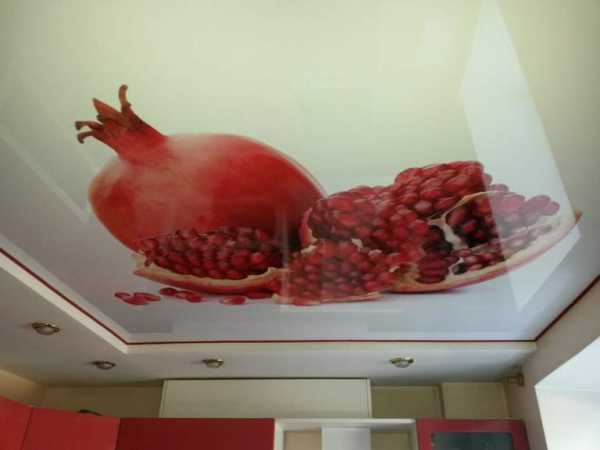 Можно использовать и глянцевый натяжной потолок с фотопечатью. Отдайте предпочтение рисункам, связанные с кухонной тематикой для большей гармоничности: овощи, фрукты, кофейные зерна.