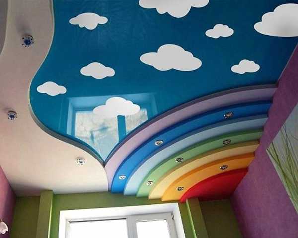 Использование фотопечати для оформления потолков дает практически неограниченный простор для фантазии. Очень красивый, на наш взгляд, вариант — облачное небо с радугой.