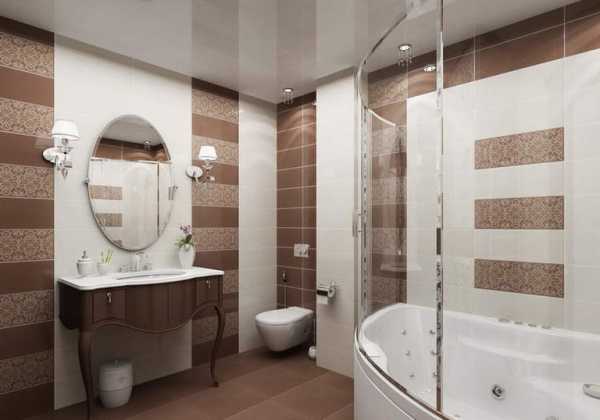 Акцентируем ваше внимание на цветовом решении: три основных цвета, два из которых используются на потолке, выгодно подчеркиваются акцентами другой фактуры. Такой прием хорош для просторных ванных комнат — он делает их визуально еще больше, зонируя при этом пространство.