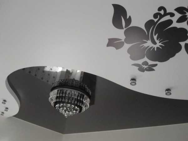 Отлично выглядят двухуровневые потолки, сочетающие глянцевую фактуру и гипсокартон — контраст материалов делает комнату объемней, а вид получается весьма интересный.