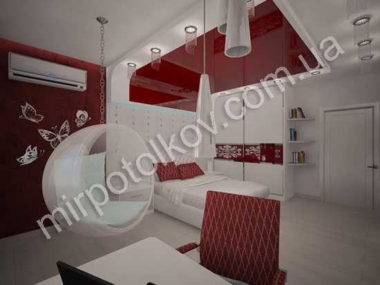 - Расстояние от «родного» потолка до ПВХ-пленки минимально, что позволяет сохранить самый ценный ресурс маленьких спален – свободное пространство.