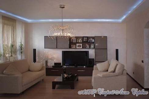 Зал в стандартном кирпичном или панельном доме – место для встречи гостей и сбора всей семьи. Лучший вариант – использование двухуровневых конструкций с подсветкой и основным освещением. Это позволит выделить отдельные зоны, а также показать достоинства помещения. Если допускает стиль интерьера, то часто используют комбинированные полотна по цвету или с фотопечатью – например, небо с облаками.