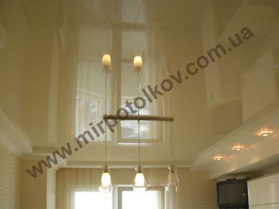 Натяжные поверхности бывают матовыми, сатиновыми и глянцевыми. Пример сатинового полотна видно на предыдущем фото. Матовое с ним схоже, только отблеска не дает совершенно. Глянцевое полотно – на фото ниже. Уровень глянца может быть разным, от среднего до зеркального. Тканевые конструкции глянцевыми не бывают. На технические характеристики фактур поверхности не влияет, поэтому выбор – дело вкуса.