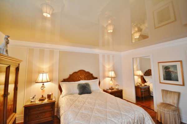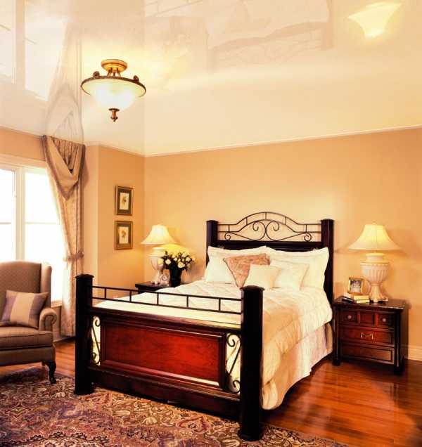 Глянцевые натяжные потолки в спальне: чем темнее поверхность, тем сильнее она отражается в себе предметы