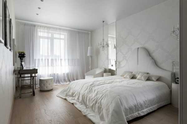 На фото представлен вариант классической спальни, имеющей матовый белый потолок.
