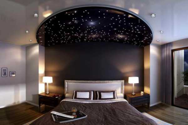 Потолки из ПВХ очень чувствительны к высоким температурам, поэтому лучше сделать выбор в пользу светодиодного освещения. Обратите внимание на натяжной потолок с подсветкой «звездное небо». Такая система была придумана специально для освещения спальни.