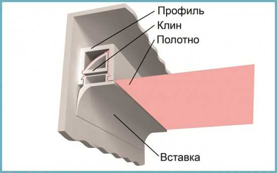 Принцип крепления к каркасному профилю напоминает прищепку, которая захватывает и надежно фиксирует края полотна.