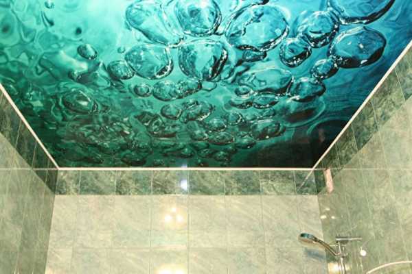 - оттенки моря – часто ванные комнаты оформляются в сине-зеленых тонах, как дань стихии воды. В таком помещении хорошим вариантом будет потолок голубого, изумрудного, бирюзового цвета или их комбинации. Эффектно будет выглядеть их сочетание с белым