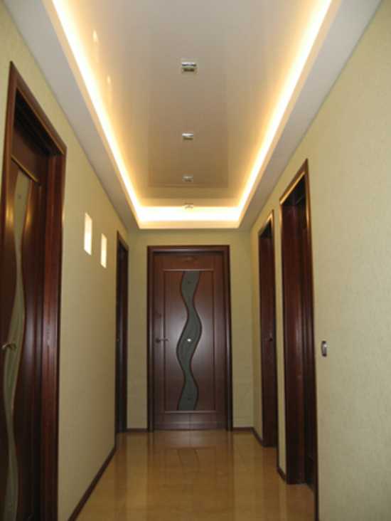 Продольное расположение осветительных приборов делает более длинным, например, коридор (прочитайте: «Потолок в коридоре с подсветкой «). Узкая комната смотрится шире, если она завершается стеной, освещенной ярким светом. При этом, если в середине помещения установить яркий осветительный прибор, то оно зрительно уменьшится (подробнее: «Как правильно расположить светильники на натяжном потолке «).