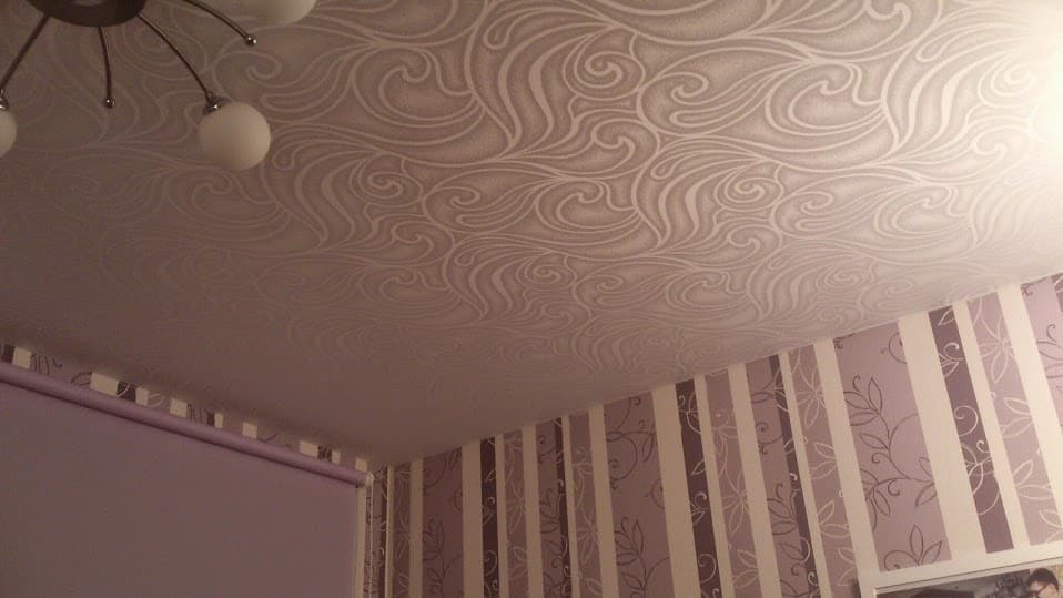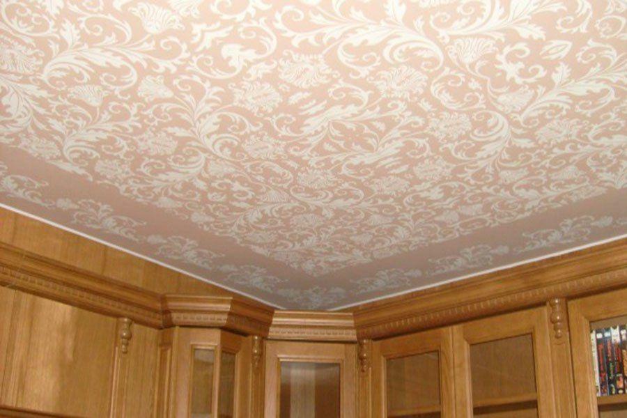 - Возможность покраски. Для этих целей используют специализированные краски из акрила. Тканевые потолки украшают любыми узорами, что дает возможность воплощать в жизнь интересные фантазии. Перекрашивать подобные изделия можно до 4-5 раз. С помощью современных технологий на тканевое полотно можно перенести целые картины или даже фотографии.