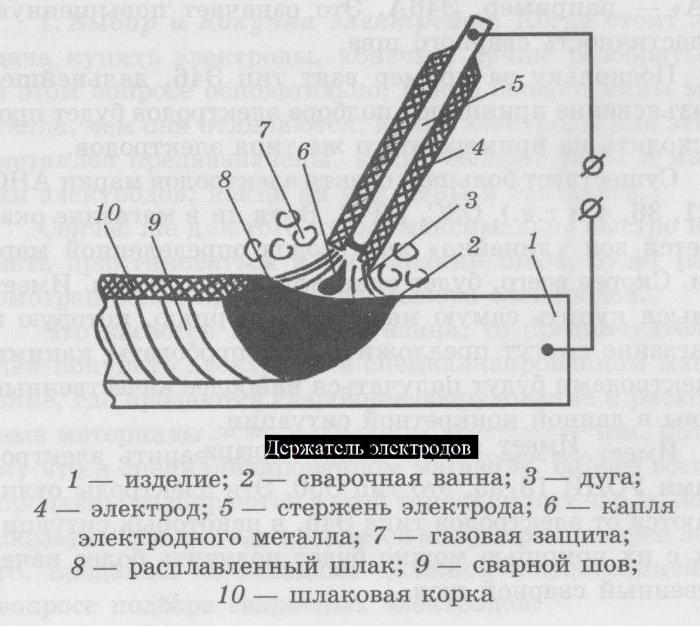 Под воздействием дуги происходит расплавление изделия и стержня электродного элемента.